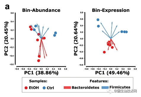 在这项最新研究中,研究人员给小鼠喂食了稳定同位素标记的乙醇,以研究乙醇代谢并追踪其去向。乙醇喂养的小鼠和对照组小鼠通过拟杆菌(Bacteroides)和厚壁菌(Firmicutes)进行区分。