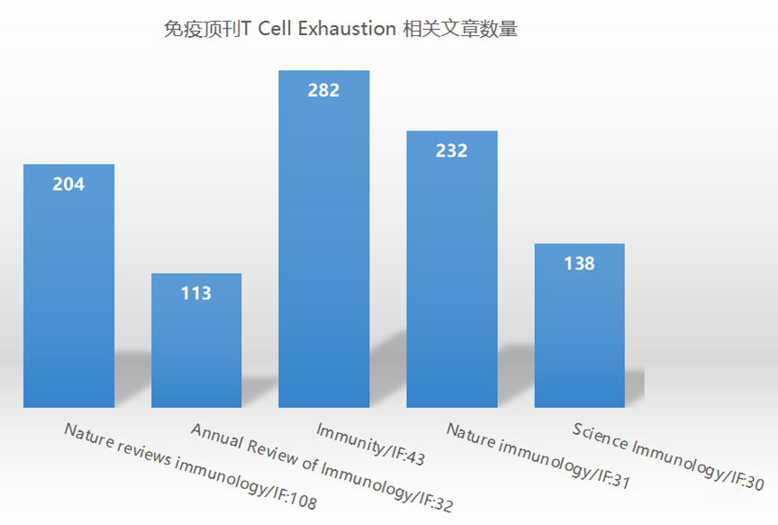 T细胞耗竭免疫学顶刊杂志统计当然,关于T细胞耗竭的文章还有很多,小编重点在免疫顶刊上搜索相关研究发表数目,可以看出免疫顶刊对T Cell Exhaustion方向是青睐有加的。