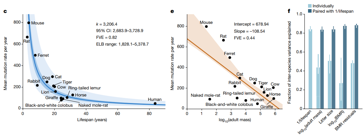 这也印证了体细胞突变导致生物衰老的理论:每年的体细胞突变率在不同物种间差异很大,但均与物种寿命呈极强的负相关关系,这是一种其他生命史特征无法比拟的关联性。