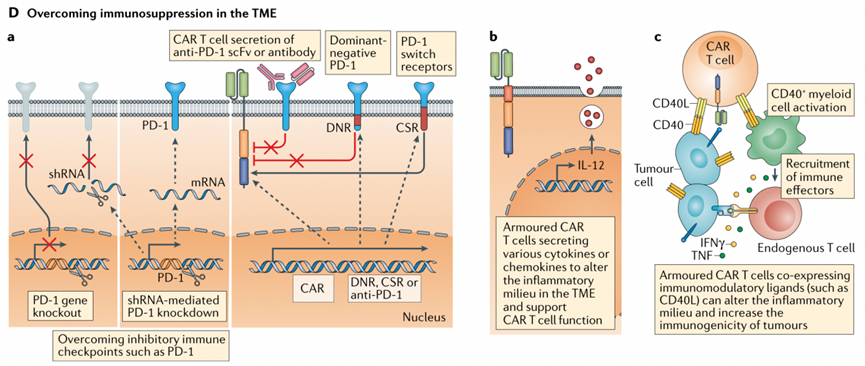 在以往研究中克服免疫抑制性肿瘤微环境的思路有:a. 限制CAR-T细胞PD-1的活性;b. 赋予CAR-T自分泌促炎因子的能力,抵消免疫抑制性肿瘤微环境 c. 使CAR-T表达免疫调节性分子,如添加的促炎分子CD40L通过与CD40的作用,不但能产生共刺激效应增强CAR-T细胞功能,而且能激活专职抗原呈递细胞,呈递肿瘤抗原,增加肿瘤细胞免疫原性,进而使肿瘤细胞被内源性T细胞识别。