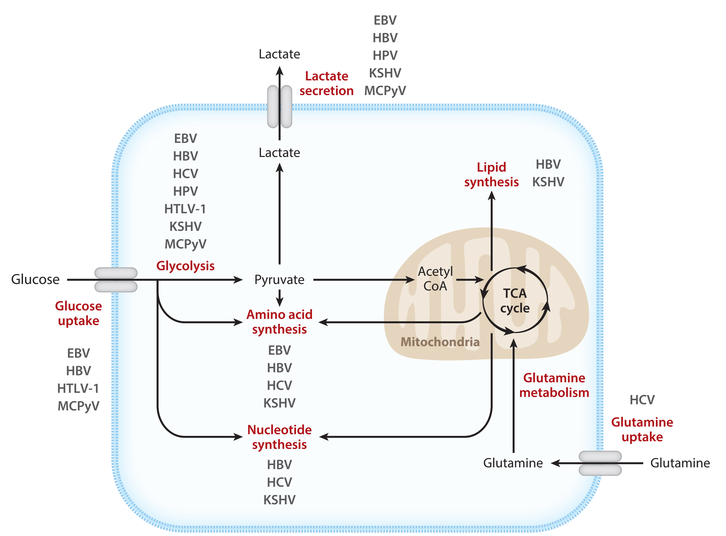 葡萄糖摄取和糖酵解在病毒感染时增强,包括丙酮酸代谢、TCA循环、氧化磷酸化在内的代谢改变都与病毒感染和复制相关。由于病毒的基因组较小,它们能够通过劫持宿主代谢获取宿主营养,重塑宿主细胞代谢状态,引起肿瘤发生。