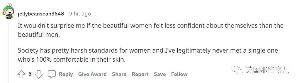 有网友认为,可能是社会规训导致女生的自信心普遍比男生低,哪怕容貌美丽也是如此。