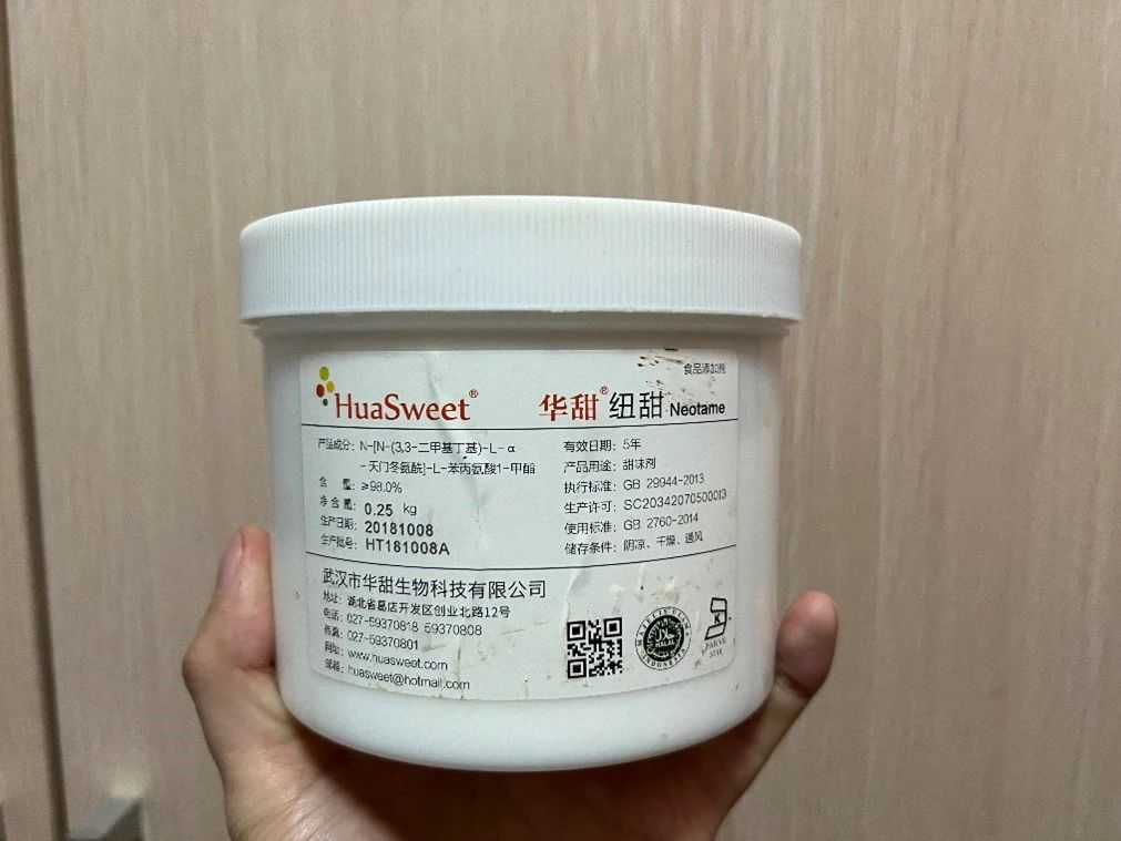还有一种非常非常甜的甜味剂叫纽甜,它的成分是N-[N-(3,3一二甲基丁基)-L-α-天冬氨酰]-L-苯丙氨酸-1-甲酯,甜度可达到蔗糖的8000倍以上。蔗糖的8000倍到底有多甜呢?作者好奇买了一罐纽甜,当打开这罐甜味剂的时候,仅仅在罐口闻了一下,嘴里就感觉到了甜味,并且这种甜味持续了整整10分钟。据说一小勺纽甜的甜味,可以承包你一年所食用蔗糖的甜味!